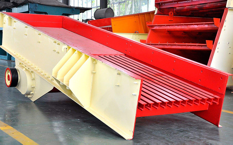 重型給料機主要由槽體、振動電機、支撐彈簧等部件組成。GF系列給料機采用振動電機作為激振源驅(qū)動設(shè)備振動,迫使物料從給料端緩慢地推至排料端。與此同時,對物料進行篩分,使其粒度更加均勻。通常,在給料機的排料端裝備有一個棒條柵篩,通過它,分離出粒度小于各棒條條間距的物料,并將較大粒度的物料輸送到破碎機內(nèi)。通過改變振動電機的激振力對給料機的給料能力進行調(diào)節(jié),可以利用安裝在給料機下部的篩層對物料進行進一步的篩分。